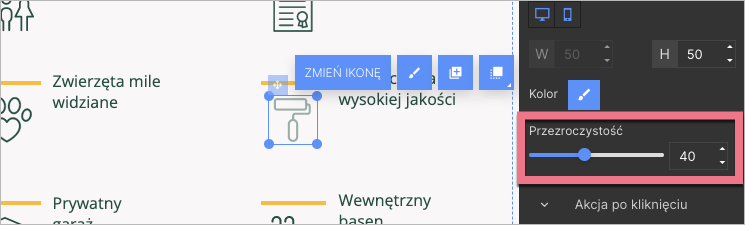 Możesz także zmienić przezroczystość ikony. Kliknij w nią i w panelu po prawej stronie dostosuj procent przezroczystości.