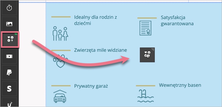 W edytorze odszukaj widget Ikona, następnie przeciągnij go i upuść w obszar aktywny.