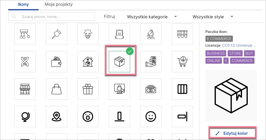 Wyświetli się biblioteka ikon. Możesz je filtrować według kategorii i stylów.