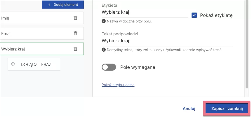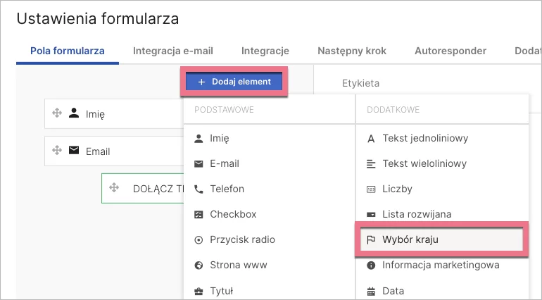 3. W zakładce Pola formularza dodaj nowy element: Wybór kraju.