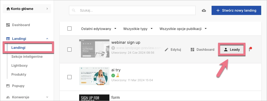 Przejdź do zakładki Landingi, wybierz landing page i kliknij Leady. Przejdziesz do zakładki Leady, ale tylko z leadami dla tej konkretnej strony. Statystyki leadów oraz współczynnik konwersji możesz podejrzeć z poziomu Dashboardu danego landing page’a.