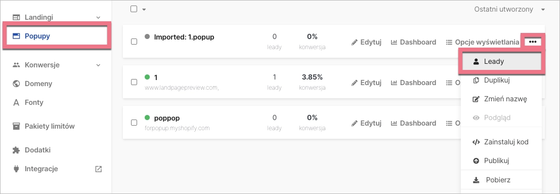 Przejdź do zakładki Pop-upy, kliknij więcej (ikona trzech kropek) i wybierz Leady. Ponownie przejdziesz do zakładki Leady. Z poziomu Dashboardu danego pop-upu możesz przeglądać statystyki leadów oraz współczynnik konwersji.