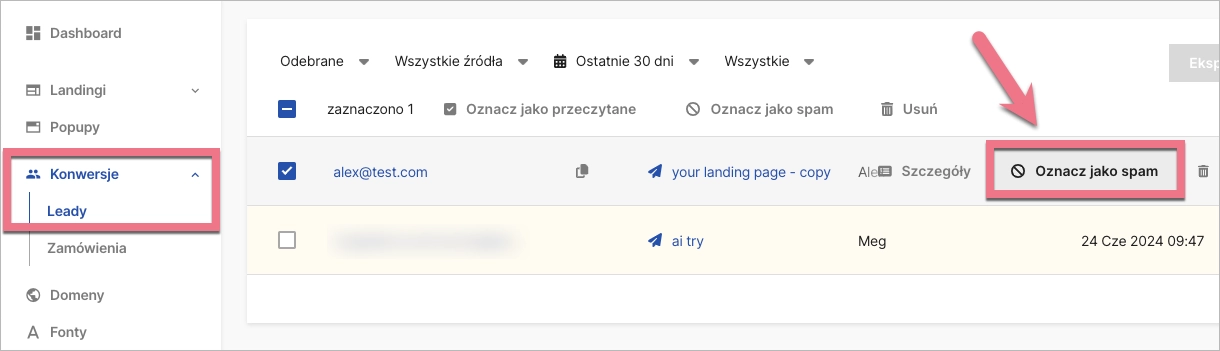 Aby oznaczyć leady jako spam, zaznacz niepożądane pozycje i kliknij przycisk Oznacz jako spam.