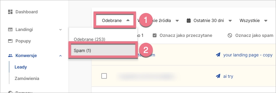 Leady zostaną przeniesione do skrzynki SPAM. Aby do niej przejść rozwiń listę (1) i wybierz SPAM (2).