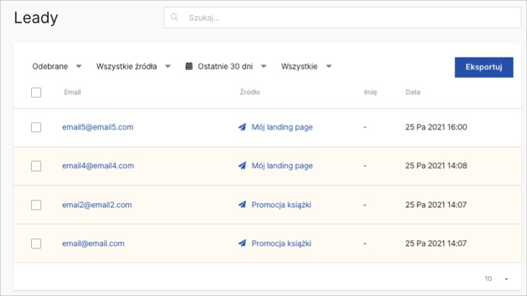 Możesz przeglądać leady zebrane przez dany landing page lub pop-up, jeśli chcesz przeanalizować wybrane wyniki kampanii.