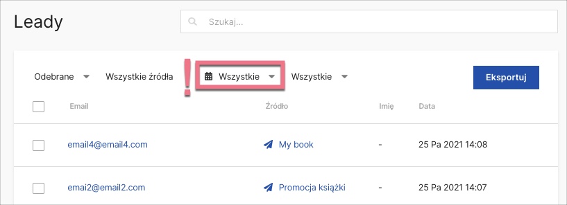 - Eksport leadów dla zakresu dat Wszystkie