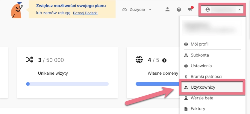 1. Zaloguj się do konta w platformie Landingi jako właściciel, kliknij w swój profil na górnym panelu, a następnie wejdź w zakładkę Użytkownicy.
