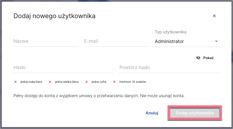 3. Uzupełnij wymagane dane: wpisz nazwę oraz e-mail i wybierz typ użytkownika. Następnie nadaj użytkownikowi hasło. Potwierdź, klikając Dodaj użytkownika.