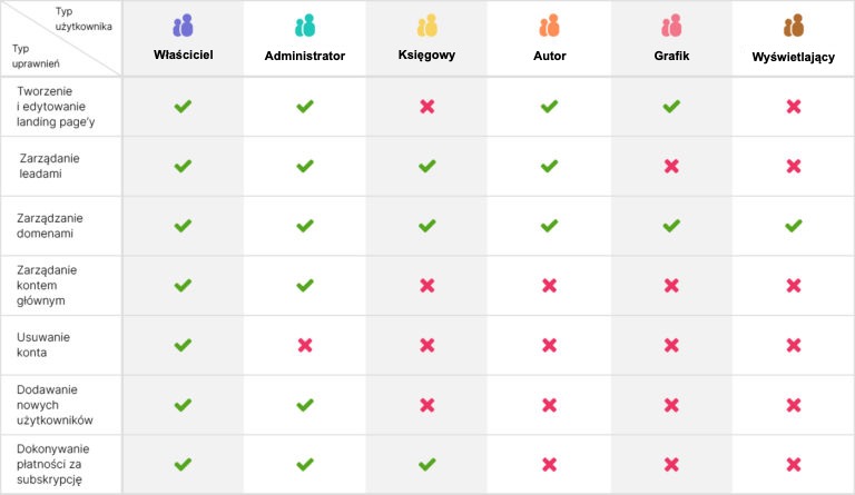 Będąc właścicielem konta biznesowego w platformie Landingi możesz dodawać innych użytkowników, których uprawnienia są szczegółowo określone.