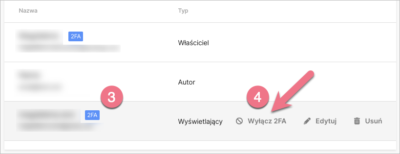W tym miejscu zobaczysz też informację o 2FA (3), gdy któryś z Twoich użytkowników włączy uwierzytelnianie dwuskładnikowe. Właściciel konta i administrator mogą również wyłączyć 2FA (4) dla danego użytkownika.