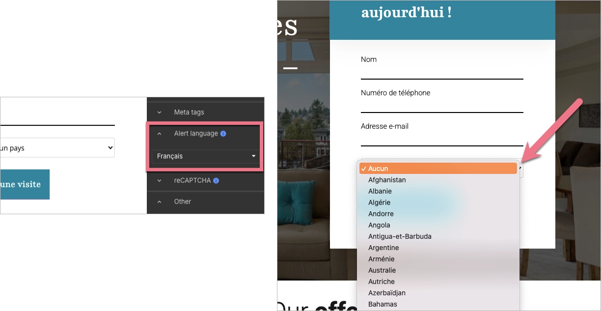 A language improvement has been added to enhance the experience for French-speaking users. When the landing page alert language is set to French, the country select field in forms will now display French translations.