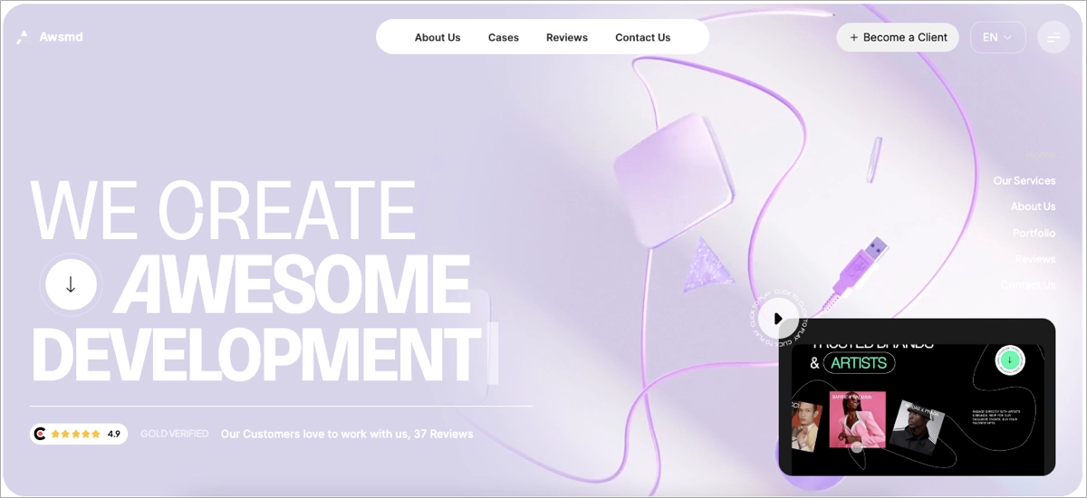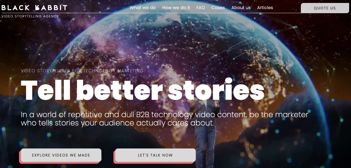 Um dos melhores exemplos de página de landing de produção de filmes e vídeos é a página da Black Rabbit, a agência de narração de vídeos. Sua página da Web chama a atenção do início ao fim, com uma impressionante animação de fundo das vitrines de suas produções. A página inclui depoimentos em vídeo e as vitrines completas de seus projetos anteriores, o que ajuda a aumentar o interesse e a confiança dos visitantes.