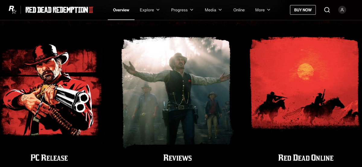 Um dos melhores exemplos de landing page de jogos é a página do jogo Red Dead Redemption 2 de Rockstar Games. A página deles se destaca por apresentar o mundo do jogo de forma atraente. Seu design mergulha os visitantes na atmosfera do jogo, com visuais cativantes que mostram o ambiente e os personagens.