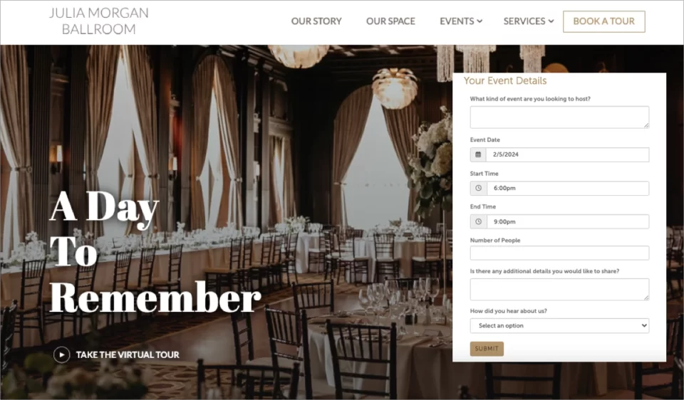 Um dos melhores exemplos de landing page de geração de leads é a landing page da Julia Morgan Ballroom, que se destaca como uma ferramenta sofisticada de geração de leads direcionada a indivíduos e organizações que buscam um local de eventos de primeira linha em São Francisco. Sua landing page deve incentivar os visitantes a reservar uma visita ao local, com o objetivo de convertê-los em clientes para casamentos, reuniões, conferências e outros eventos.