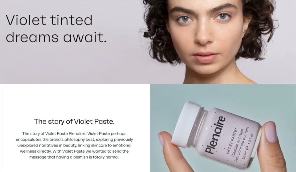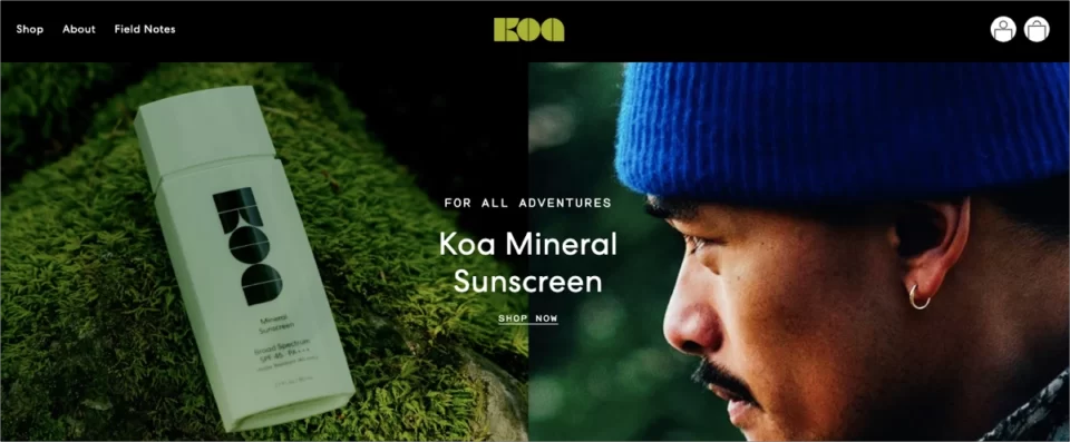 Um dos melhores exemplos de landing page de beleza e cosméticos é a página de Koa, que promove produtos ecológicos. Sua página é simples, mas as imagens visualmente atraentes a tornam atraente para os visitantes. Manchetes diretas e visualizações de produtos incentivam os visitantes a agir e comprar produtos.