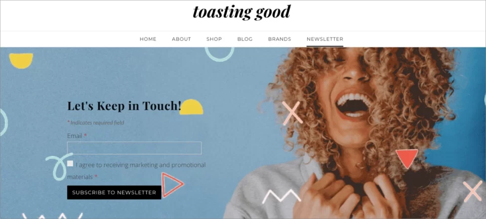 Sua página inclui uma apresentação de várias coleções e uma lista de seus best-sellers. A proposta de valor exclusivo é projetada como uma seção de destaque com uma breve descrição dos principais atributos. O rodapé da página inclui um único formulário de opt-in para se tornar um assinante do boletim informativo e uma oferta de desconto atraente para os assinantes, embora essa seção pudesse se tornar ainda mais visível.
