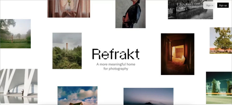 Um dos melhores exemplos de landing page de fotografia é a página da Refrakt, que oferece uma plataforma social para entusiastas e profissionais da fotografia. A página deles se destaca pelo design impressionante: assim que o visitante entra na landing page, as imagens que flutuam em um fundo branco aparecem, roubando a atenção por um tempo.