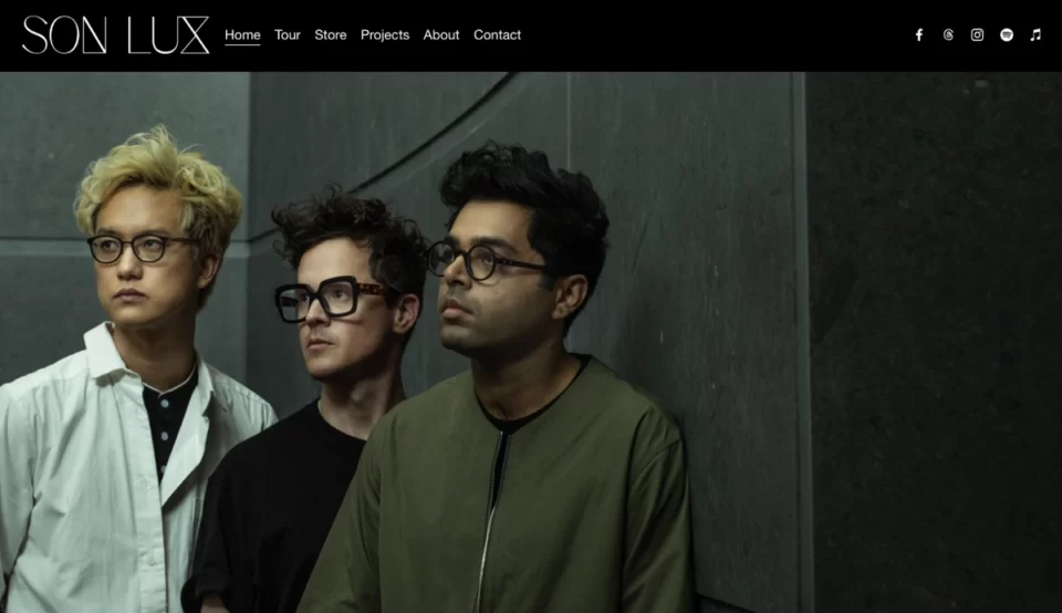 Um dos melhores exemplos de landing page para músicos é a página da banda Son Lux, que apresenta seu conteúdo e incentiva os visitantes a segui-los em várias plataformas de mídia social. O lado informativo da página é bem escrito, e a barra de navegação perfeitamente projetada não deixa dúvidas para os usuários.