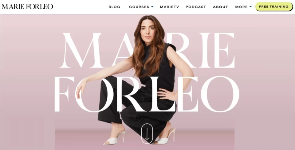 Um dos melhores exemplos de landing page de influenciador é a página de Marie Forleo, a estrela do podcast e premiada MarieTV que ajuda as pessoas a transformar seus sonhos em realidade, mostrando-lhes como despertar a produtividade. O objetivo de sua landing page é incentivar os visitantes a se inscreverem no treinamento gratuito e reunir leads para a realização de estratégias de marketing adicionais.