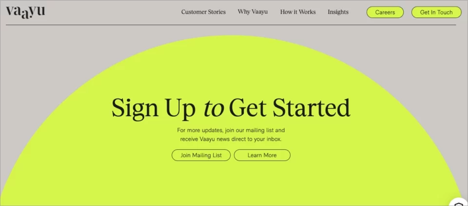 Um dos melhores exemplos de landing page de startup é a página Vaayu, que comunica com eficácia sua proposta de valor exclusiva no gerenciamento de carbono e impacto para o setor de varejo. Ele apresenta um design limpo e moderno que se alinha com seu foco em sustentabilidade e tecnologia. O site utiliza recursos visuais atraentes e textos concisos e convincentes para explicar como o software ajuda os varejistas a reduzir a pegada de carbono.