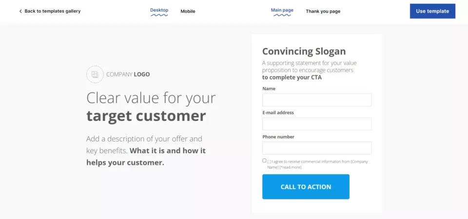 Crie uma landing page como a acima com este modelo Landingi: Geração de leads simples