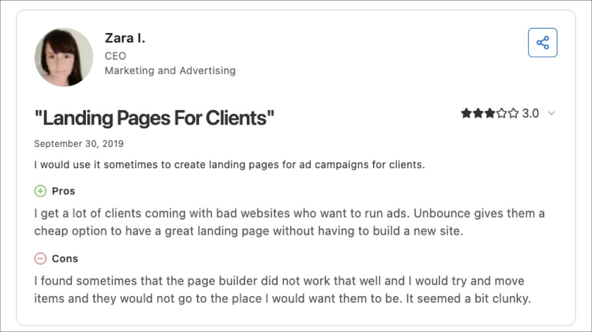 Muitos usuários elogiam o Unbounce por seu forte foco na otimização de conversões. Eles mencionam com frequência que o construtor do tipo arrastar e soltar é intuitivo e rápido, facilitando a criação de sites refinados e de alto desempenho sem codificação.