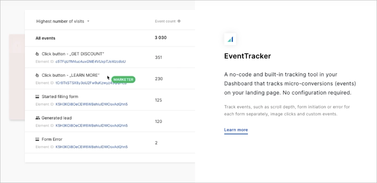 Você também pode escolher uma plataforma multifuncional, como a Landingi, com o EventTracker incorporado, para acompanhar dados reais sobre microconversões. Ele mostra o potencial de sua página e fornece insights sobre áreas de aprimoramento.