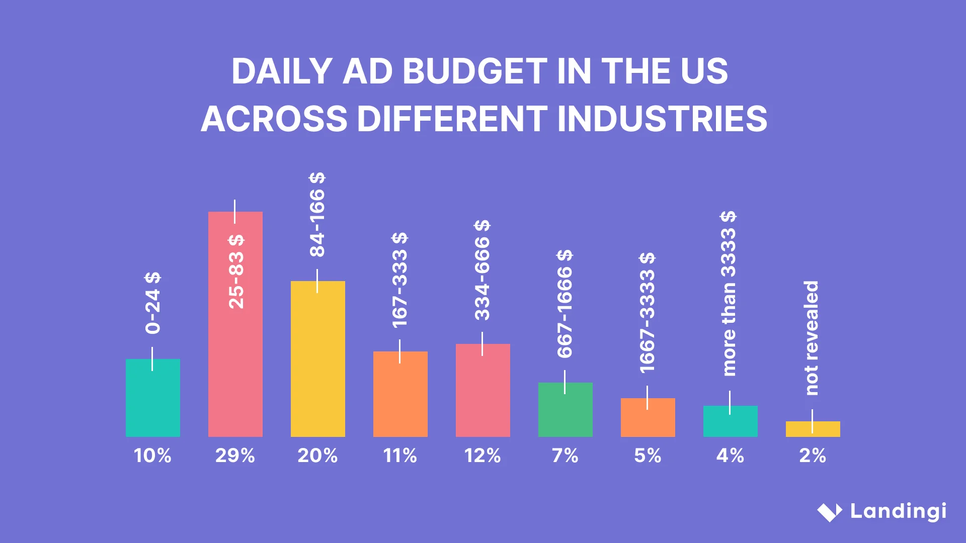 Está se perguntando qual é o tamanho dos orçamentos diários de PPC? Dê uma olhada na visão geral a seguir. Ela foi preparada com base nos dados do WordStream para empresas que operam nos EUA em 2022 (convertidos de valores mensais para gastos diários). É claro que os custos atuais são certamente mais altos, mas esses números devem lhe dar uma ideia de quanto dinheiro está envolvido.