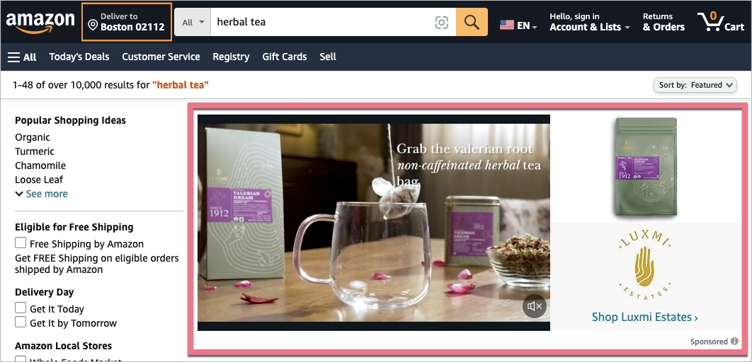 Por exemplo, uma empresa que vende chá orgânico pode usar os anúncios da Amazon para aumentar a visibilidade do produto. Ela pode configurar um anúncio de produtos patrocinados direcionado a palavras-chave como “chá verde orgânico” ou “chá de ervas”. Quando os usuários da Amazon pesquisarem esses termos, o produto de chá orgânico da empresa poderá aparecer na parte superior dos resultados da pesquisa, rotulado como “Patrocinado”. Esse posicionamento pode levar a mais cliques de clientes especificamente interessados em chá orgânico, aumentando potencialmente as vendas e as classificações de produtos na Amazon.