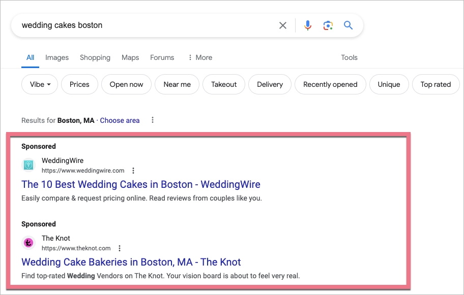 Imagine uma padaria local especializada em bolos de casamento que deseja aumentar sua base de clientes em Boston. Para isso, a padaria decide usar um anúncio de pesquisa do Google. Ela tem como alvo palavras-chave como “bolos de casamento em Boston” e “melhores bolos de casamento”. Quando as pessoas em sua área pesquisam esses termos na Pesquisa Google, o anúncio da padaria aparece na parte superior da SERP, tornando-o altamente visível para os clientes em potencial que estão procurando ativamente por bolos de casamento. Ao clicar no anúncio de pesquisa PPC, os usuários são direcionados ao site ou à landing page da padaria, onde podem saber mais sobre os bolos de casamento, sua localização e como fazer um pedido. Essa abordagem direcionada permite que a padaria se conecte com usuários que têm uma alta intenção de compra, aumentando assim as chances de convertê-los em clientes.