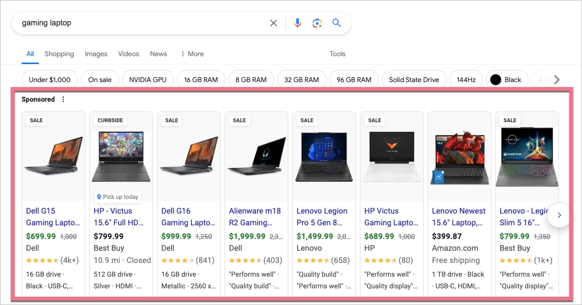Imagine que você está procurando um novo notebook para jogos na Internet. Você acessa o Google, digita “gaming laptops” e a página de resultados da pesquisa ganha vida com uma seção que apresenta vários laptops para jogos. Essa área, preenchida com imagens vívidas de cada modelo, juntamente com seus preços e nomes de marcas, é o resultado direto de uma campanha de compras do Google.